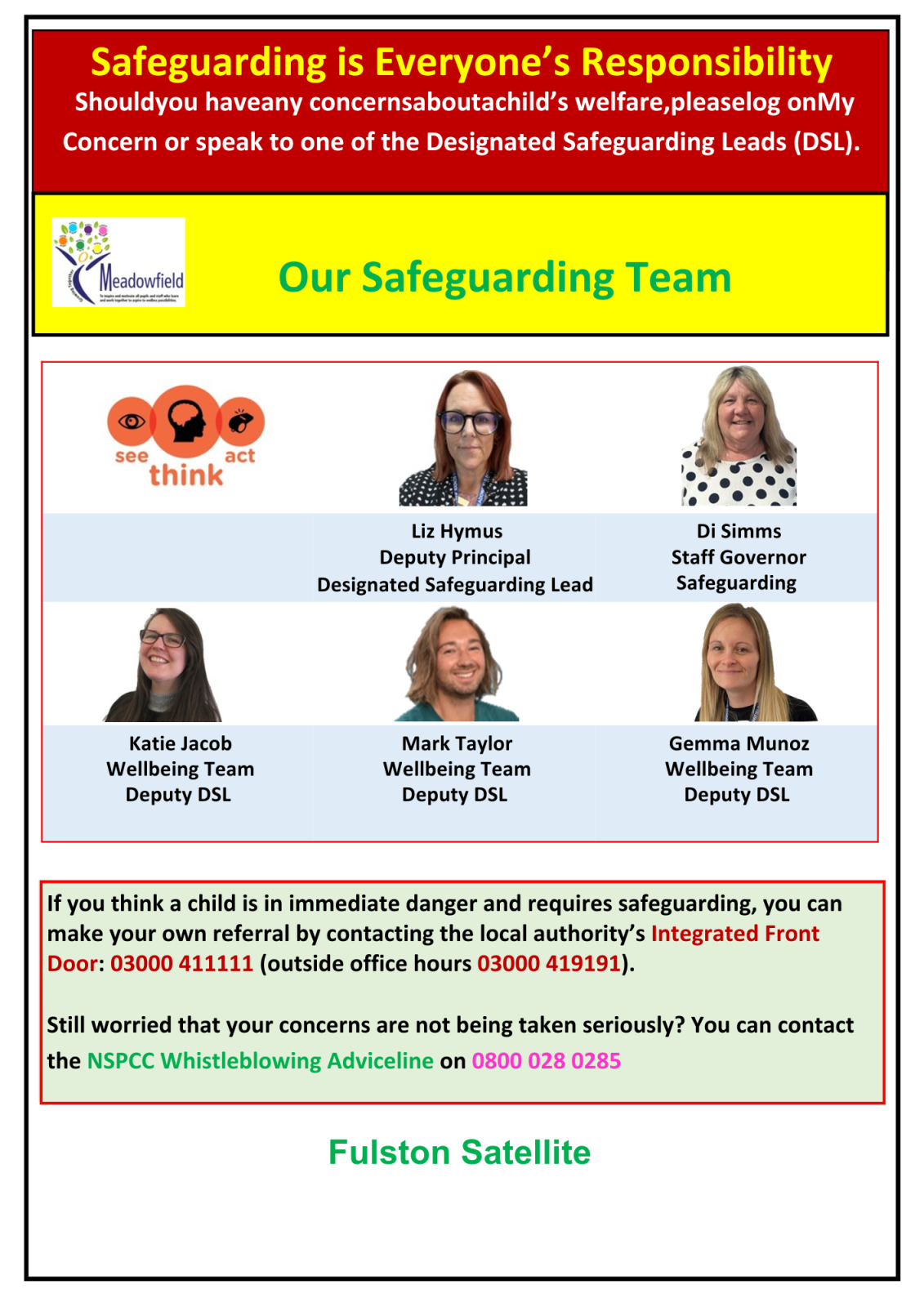 If you have any serious concerns about your child or any other student at Meadowfield School please do not hesitate to contact a member of the Safeguarding Team who will be able to provide you with the best advice and help using the appropriate degree of confidentiality.