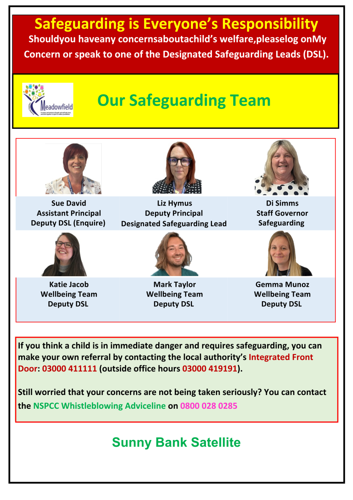 If you have any serious concerns about your child or any other student at Meadowfield School please do not hesitate to contact a member of the Safeguarding Team who will be able to provide you with the best advice and help using the appropriate degree of confidentiality.